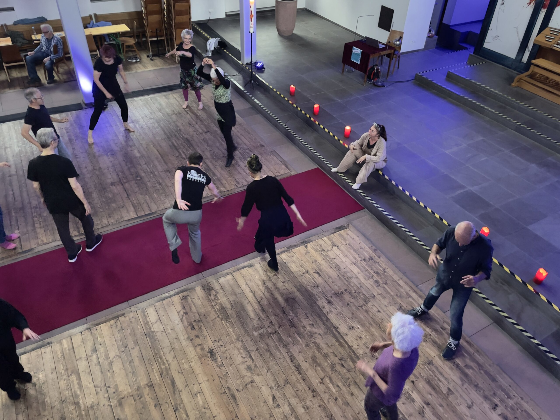 Die Kirche ist leergeräumt, aber wirkt keineswegs verlassen. Im Mittelschiff stehen und bewegen sich Menschen, ihre Arme schwingen, Füße ertasten den Boden – barfuß, in Strümpfen oder Schuhen. Der Holzboden knarrt. Manche Augen sind halb geschlossen, andere im regen Kontakt mit einer anderen Person. Während die einen sich, wie mit einem unsichtbaren Band verbunden, im gleichen Rhythmus bewegen, tanzt ein anderer losgelöst von irgendwelchen Erwartungen sein langsames, zärtlich-hingebendes Gebet.
